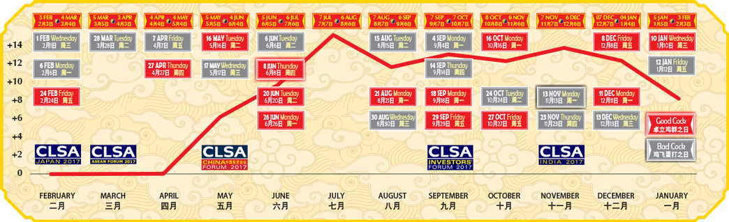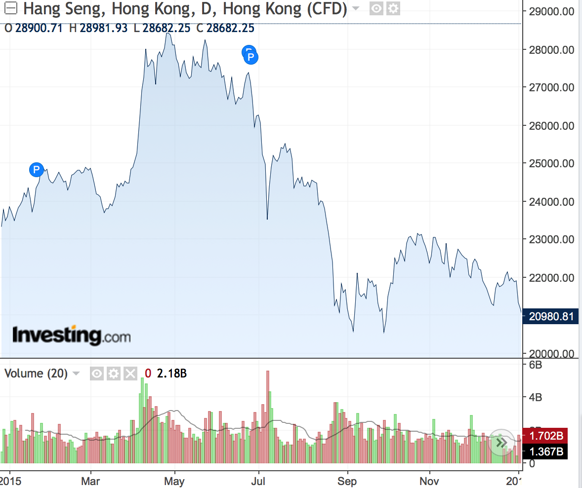 そしてチャイナショックの2015年。先立って中国株バブルがあり、それを見て割安だった香港株も一時目が眩むようなバブルになった。風水は年前半の上昇を当てることができた。そして6月から上海株バブルが崩壊すると香港株バブルも崩壊、断崖のような下落となった。風水では断崖の形は描けなかったが、9月まで下落という方向性は当てられた。そして11月の小さな戻り高値も無駄に当てている。もっとも、年間を通してマイナスで終わったことを当てるのには失敗している。