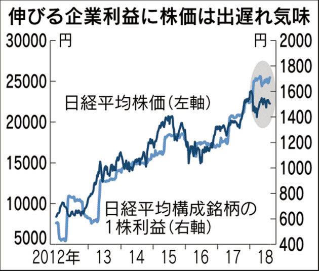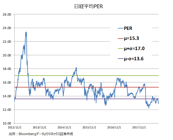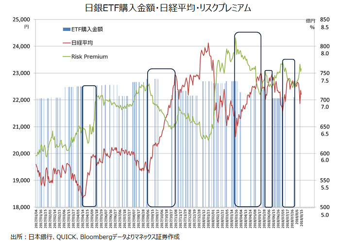 足元では日経平均企業EPSが上昇している一方で株価はキャッチアップできていないため、PERは低迷している。ではリスクプレミアムが高すぎるかというと、先行きに対する見通しとリスクプレミアムは正確に切り分けることは難しい。アベノミクス開始時にはEPSが動き始める前から株価とPERが上がり始めていたが、では株が割高だったかとというとそうでもない。貿易戦争や円高などで足元のEPSを維持できないと判断された場合はその逆が起きることもあり得る。その時に、日銀はそれに逆らってあくまでもPERが一定になるまで、つまり指数が指数EPSが同じチャートを描くようETF買入れ介入を行うべきかというと、明らかにそれをやる意義は薄い。散々買入れを行なった挙句に、本当にEPSが落ち込んできてPERが正常化したら買入れをやめるべきということにもなる。もちろん、市場参加者が考えすぎに陥っており結局EPSの落ち込みがやって来ない場合もあり、その時はPERの低さがまさに「疑い深い市場参加者が要求したリスクプレミアム」のせいということになり、割安さの修正がどこかで進むだろう。