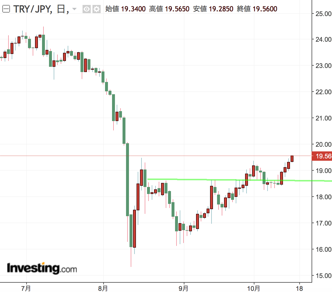 8月に急落劇を演じ、多くの本邦投資家の肝を冷やしたトルコリラの下落が一服している。2016年の反大統領クーデターを支援したという罪で米国人牧師を拘束して米国との関係が悪化して経済制裁を受け、また通貨安インフレが亢進、更にエルドアン大統領がインフレ退治に動こうとする中銀の利上げを批判・牽制したりと、一時期は救いようがなかったトルコリラだが、先週にはブランソン牧師を「有罪だが長い拘束期間で既に刑期を終えた」という名目で釈放し、懸念材料が減ってきている。