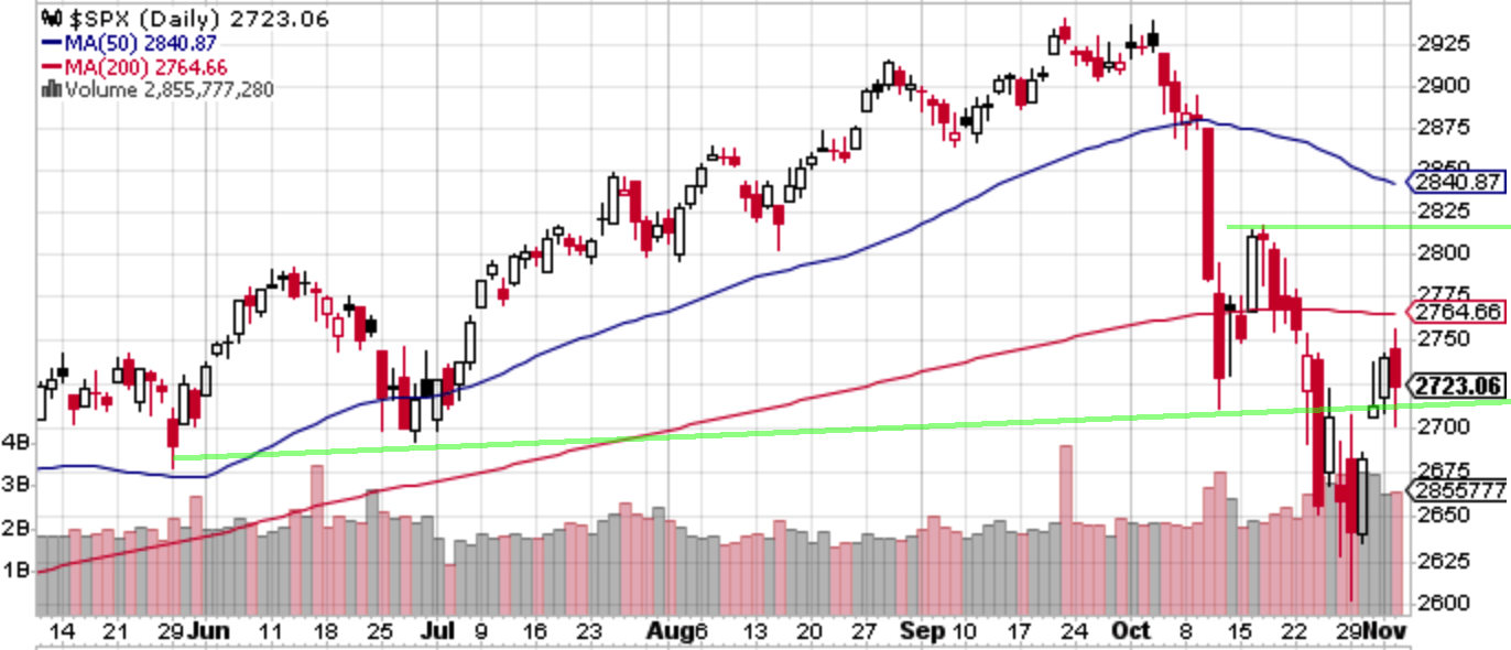 米株指数を純粋なテクニカルで見る November 03, 2018 20:58 今回の米株の急落→反発が千載一遇の買い場か、ダウントレンドの中の弱い反発で終わるかについて、他を全て無視して純粋にチャートだけで見たらどう見えるだろうか。日足で見るとS&P 500は10月が右肩となるヘッドアンドショルダーとなっており、10月後半の戻り高値である2815がレジスタンスとなる。2700後半まで反発した場合は一旦ロングを手仕舞うのが定石となる。逆に2815を上にブレイクできた場合はトップを再び目指す可能性が高くなる。 一方、週足で見ると、まずVIXショック前高値を更新した後に、2530のVIXショック後安値をまだ割っていないため、ダウ理論ではまだ上昇トレンドが保たれている。今週2600を付けた時はやや危うかったが、そこからは反発して綺麗な週足下ヒゲ陽線を作っている。中間選挙や、貿易戦争など(上下の)リスク要因は控えているが、基本的に2600台前半は押し目買い、2700台後半は戻り売り、そして2530か2815をブレイクした場合は付いていく、ということになるだろうか。 この記事は投資行動を推奨するものではありません。 「S&P 500」カテゴリの最新記事 タグ :#米株#米国株#チャート#テクニカル < 前の記事次の記事 >