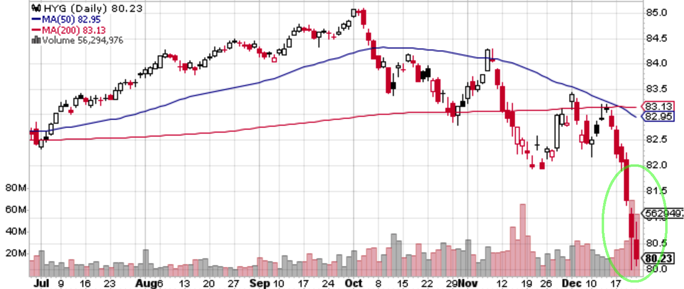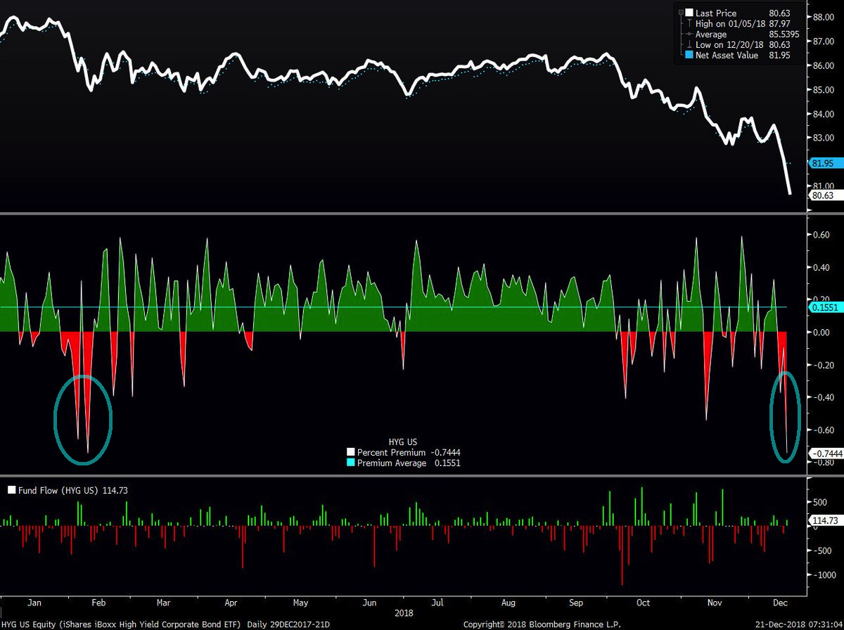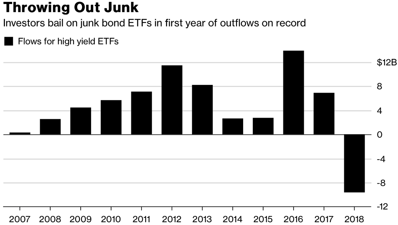 12月中にHYG, JNKなどのハイイールド債ETFは26億ドルの引き出しに遭っており、またその結果2018年は初めて純流出の年となった。
