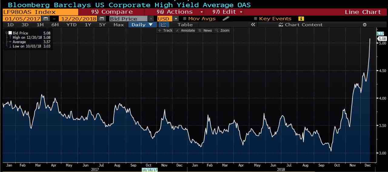 ところで、ハイイールド債のクラッシュは何か我々が知らない深刻な危機を表現しているだろうか。FOMCの利上げで債券も安全資産でなくなったのがきっかけという推測もあるが、肝心の米金利は別に上がっていない。あくまでもS&P 500のクラッシュに揺さぶられてのリアクションに見える。激しくぶん投げたのが恐らく個々の社債発行体を調査しておらず、代わりに他の資産をモニターしやすいETF投資家であったこともそれを裏付けている。クラッシュの影響としては、12月はこのままでは過去10年以来初めてハイイールド債発行がなかった月になりそうということで、企業の資金繰りに多少の悪影響が出る可能性はある。一方、どこかの銀行がハイイールド債を大量に抱えており、この値動きで薄い資本を食われてシステミックリスクに発展する、などということはこのご時世ありそうにない。また、Fedは当然ある程度株価指数もモニターしているが、株が下がったからと言って金融政策を変えることはなさそうだが、債券、特にクレジット周りのクラッシュにはより注意を払っているはずだ。関連記事