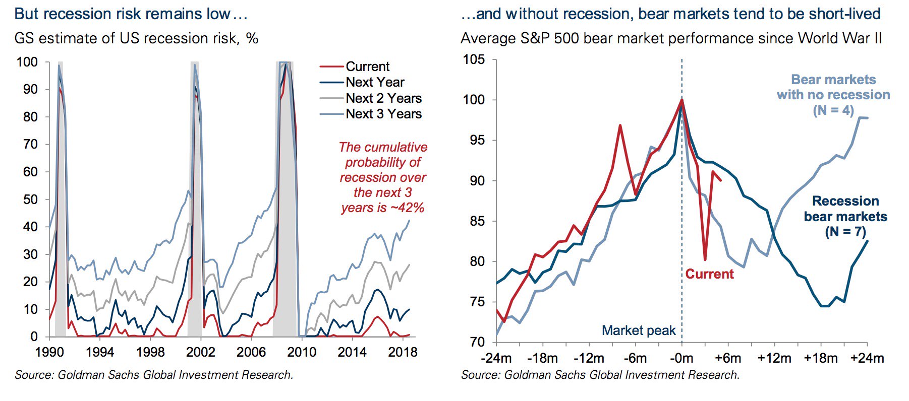 ネットに転がっていたGSのレポートは右図でWW2以降の11回のS&P 500のベアマーケット入り後のパフォーマンスの平均をリセッション入りした場合・リセッション入りしなかった場合に分けて示している。そして左図が示すようにリセッション入りする可能性は高くない。問題はたとえリセッション入りしないにしてもこの回復は前例対比でとても急な方に入っているということだ。