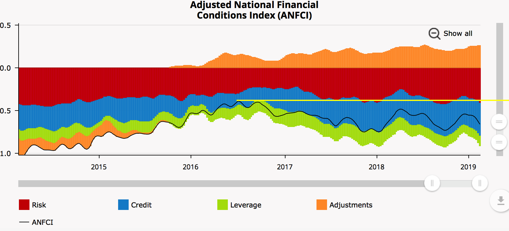 常軌を逸したS&P 500の急上昇は、二人の重要人物を人質に取るのに成功したのが背景である。一人はFedのパウエル議長である。Fedが利上げをチキってしまったため、米国をはじめとする全世界で金融緩和の波が全てを洗い流している。普通ならばここまで株が上がれば、またよりプロフェッショナルに言えばシカゴ連銀のFinancial Condition Indexが利上げを休止した2016年の水準から再び遠ざかったのを見て、再び無慈悲な引締めに転じても良いと思えるものの、Fedは自分達がハト化したからこそ株が戻ってきたのをよく承知しているはずだ。