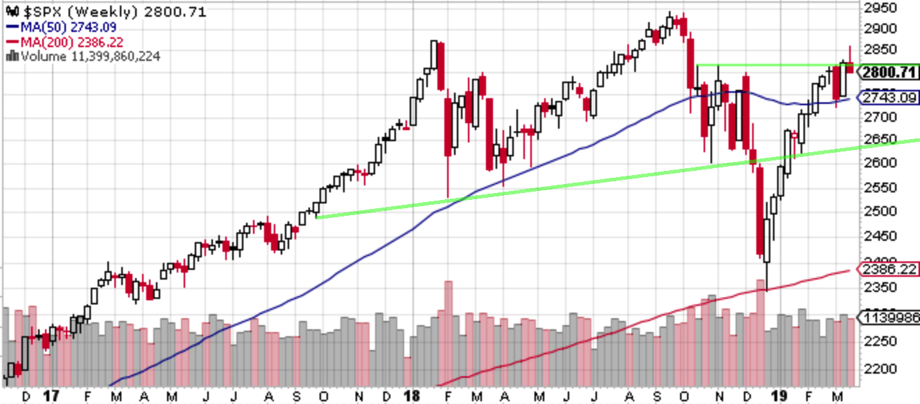 長短金利逆転はリセッションの良い預言者であるとしてもリセッションまでは1年〜1年半の余裕があり、インバート後の株のパフォーマンスも悪くないものの、いよいよチキンレースの自覚が必要となってくる。明らかに「S&P 500が3,000に行けばこの長期ポジションはいくら儲かる」と画餅している場合ではない。12年前のサブプライム前の相場について勉強した時は我々は「全力で株を買って、長短金利逆転を見てリセッションを予想して株を売ればいいじゃないか、簡単簡単」と思わなかったか。一方、リセッションの前に世界中同時金融緩和の波が来ているのも事実であり、また長いチャート的にも右肩ブレイクがまだ効いているため、12月の底に向けて大きくクラッシュするようにも見えない。結局、逆張りの精神で押し目買いと早めの利食い回転に尽きる。テクニカルには先週の週足上ヒゲ陰線のヒゲにあたる2860がレジスタンス、サポートは先々週安値の2720付近とネックラインの2640付近となる。