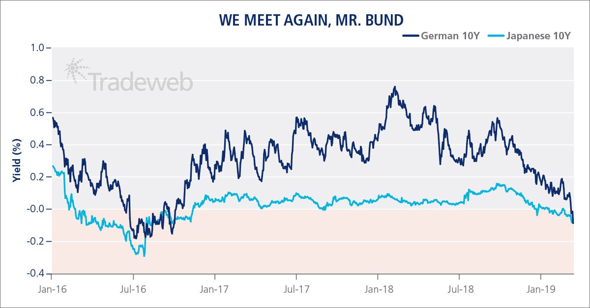 大手ブローカーTradeWebのツイッターアカウントに「We meet again」と煽られているように、ドイツ国債10年金利は3年ぶりに日本国債10年金利に追い付いた。元よりイタリアがテクニカルリセッション、ドイツも辛うじてリセッションを回避したという程度には景気が悪い中で世界中銀のハト化(トップバッターはFedとPBOC、最新はRBNZ)が重なり、ECBのドラギ総裁がマイナス金利の副作用の強さに耐えかねて預金金利の階層設定導入を検討しているとのヘッドラインがとどめとなった。このままではドラギ総裁は歴代ECB総裁の中で利上げ童貞のまま退任する初めての総裁となる。
