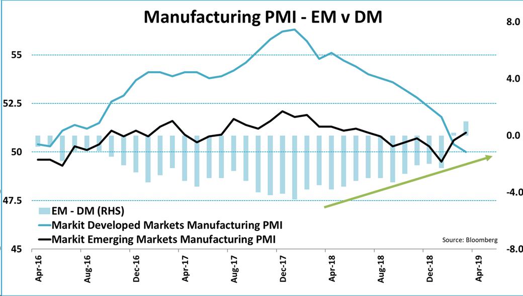 とはいえISMの反発はそこまでではない。また欧州の景況感だけはピクリとも改善しない。中国の反発と欧州のイケてなさの結果、新興国(EM)の製造業PMIは久方ぶりに先進国(DM)の製造業PMIを逆転した。