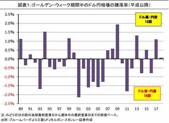 円については、ユーロというもう一つのファンディング通貨が出来ているため、キャリーポジションを構築するにしてもファンディング通貨は分散されてきており、昔ほどは「リスクオフ=キャリーポジションの巻戻し=円高」ではなくなっている。だからこそ2017年も2018年もドル円が10円以下の値幅に収まったのではないか。またその結果GW中の円相場も冒頭のチャートが示すように、2000年代初頭を中心に円高が多かったのに対して直近は円高と円安が半々である。なお、キャリーポジションの運用サイドについてはかつては「高金利先進国」などという括りもあったが、今はドル金利が豪州金利などよりも高くなっており、キャリー源は米ドルに一極集中している。