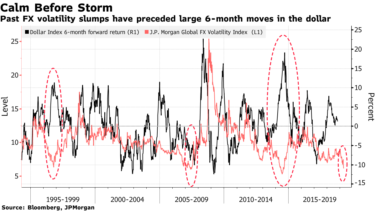 Bloomberg記事によると、ドルインデックスの過去の異常なボラティリティの低下は毎回どちらかの方向への大きな変動に繋がってきた。低ボラティリティでは市場参加者の想定レンジも狭くなってポジションが大きくなりがちなので吹っ飛びやすくなるのは当たり前で、「いつかどちらかの方向に大きく」ではあまり情報としてバリューがないが、過去チャートを見る限りでは概ねドル高に繋がってきたように見える。今からサプライズドル安になるとすれば、FOMCが完全に利下げ・金融緩和方向に舵を切るケースくらいしか考えられないが(なおそのケースではそれなりのドル安方向のインパクトがあるはずだ)、景況感が最悪期を脱した今にあえてそれをやる必要性は薄いと思われる。