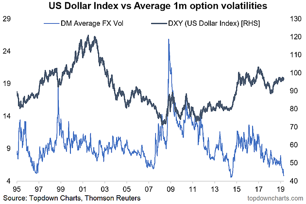 ところで、足元ではドル円をはじめとして各通貨のボラティリティが類を見ないほど低下している。米国が利上げ休止に入り、ECBもテーパリングを先送りしたことにより主要国の金融政策の不確定性は低下した。更に一部の生命保険会社が高騰するヘッジコストを回避するためにコールオプションの売りを利用したりしているのもボラティリティの抑制に繋がっている。