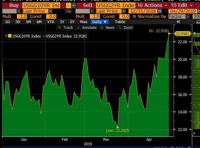 ところで、ブルスティープニングとはいえ、スティープニングは巷で話題になっていた「リセッションを預言する2y -10yの長短金利インバート」から遠ざかったことを意味する。1-3月期の景況感の小反発をもって「米金利が正しく大幅に上昇してゴルディロックが終了する」と見ていた勢は見事に裏切られたようだ。米株との齟齬も指摘されるが、市場が織り込んでいるのは「1998年型の利下げ」だそうだ。アジア金融危機やLTCMショック、そして米株の瞬間的な調整はあったが、基本的に米経済が堅調な中でグリーンスパン議長(当時)は予防的な利下げを敢行し、その後のITバブルの下地を作った。2y -10yはそれまで今と同じくベタッと0に張り付いていたが、この予防的利下げのおかげで(ブルスティープニングは一瞬だったが)2000年まで2y -10yインバートは持ち越された。エヴァンス理事も1998年型の利下げに対してまんざらでもない。