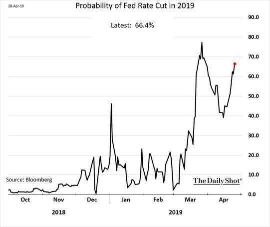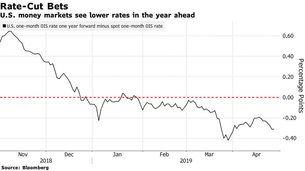 米金利のブルスティープニングが続いている。3月末のFOMC後の2019年利下げ織り込み(下図)は米中の好調な景況感指標が相次いだ4月になって一段落したものの、足元では再び首をもたげている。一時4割まで低下していた利下げ織り込みは再び6割台まで上昇した。また1年後の予想政策金利変動幅(上図)は3月末に-40bp(利下げ1.6回)から一時期-20bpまで反発したが、再び-30bp台に突入している(常識的に考えて25bpが一回分)。