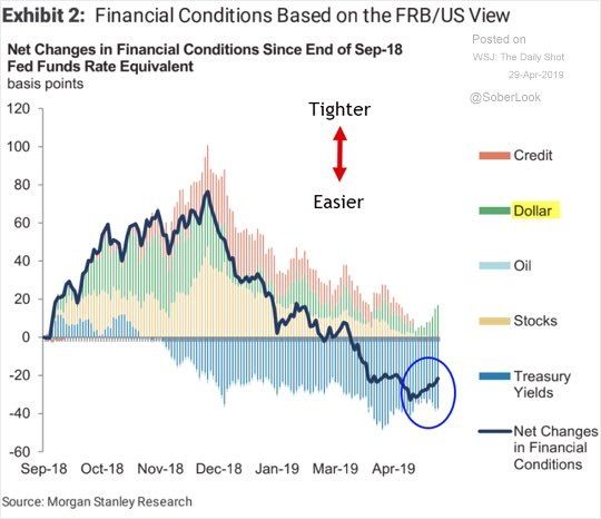 とはいえ筆者にはまだ「Fedがトランプ大統領の意向と関係なく利下げで高圧経済・米株バブルを積極的に作り出す」というストーリーにあまり現実性を感じていないのが正直なところである。エヴァンス理事の主張もあくまでも彼の意見である。ただ、それに先立って米国以外の中銀が次々とハト化していくことによってもたらされた米ドルの独歩高については「外貨建て債務が重い新興国にストレスがかかることになり、中期的にはあまり嬉しい展開ではないように見える」としていたが、実際にMorgan Stanleyが再現したFCI(金融ストレス指数)にドル高は引締め方向のインパクトを与えていたようであり、ドル高への驀進もFedの選択肢を狭めていくものだ。とりあえずは4月のFOMCで温度感を探ることになるだろう。