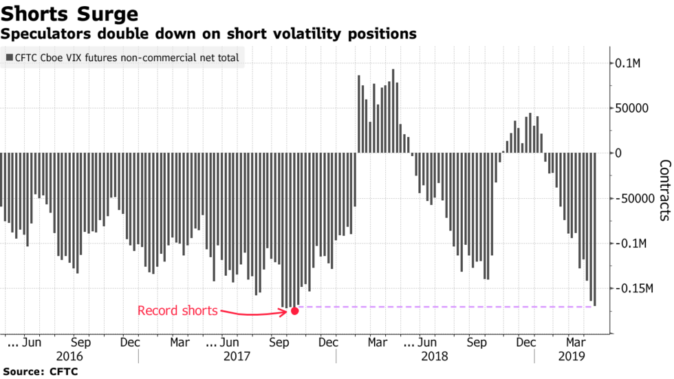 またFedのハト化に伴いVIXにも投機的なショートポジション(ボラティリティが上がらないことにベットするブルポジション)が積み上がっている。4月にはVIX先物の投機的ショートポジションが過去最大となった。これは何かのショックがあった場合に押すな押すなとなるリスクの高まりを示している。VIXの数字が上に飛んだ場合、リスクパリティなどのアセットアロケーターも押すな押すなとなる。もっとも、前回の記録的なショートが作られたのは2017年9月であり、そこから現にボラティリティは抑制され、2018年2月のVIXショック前にはVIXショートは既に畳まれ始めたので、記録的なショートそのものが直ちにショートカバーを誘発するわけではない。