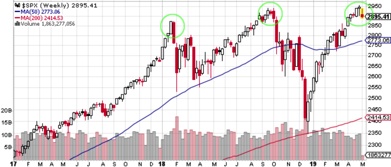 4月の米株はFed関係者のハト化示唆などもあって延々とゴルディロックを演じた。本ブログが最後に示したS&P 500の2860レジスタンスはあっさりブレイクされ、2018年高値を更新した。1年あまりをかけたヘッドアンドショルダーの右肩が3月にブレイクされたことをもって、過去最高値更新は時間の問題となっていたが、あっさり更新してしまったわけだ。筆者などは途中で気持ちが揺らぐことがあっても基本的に2400台から押し目買いを推してきたので、景況感の1月底入れ3月反発を見てもあまり高値を追いかけたくなかったし、たとえ最高値を更新して俗に言う「新高値に売りなし」の図となってもその気持ちは変わらない。2018年9月も新高値は売りだったではないか。