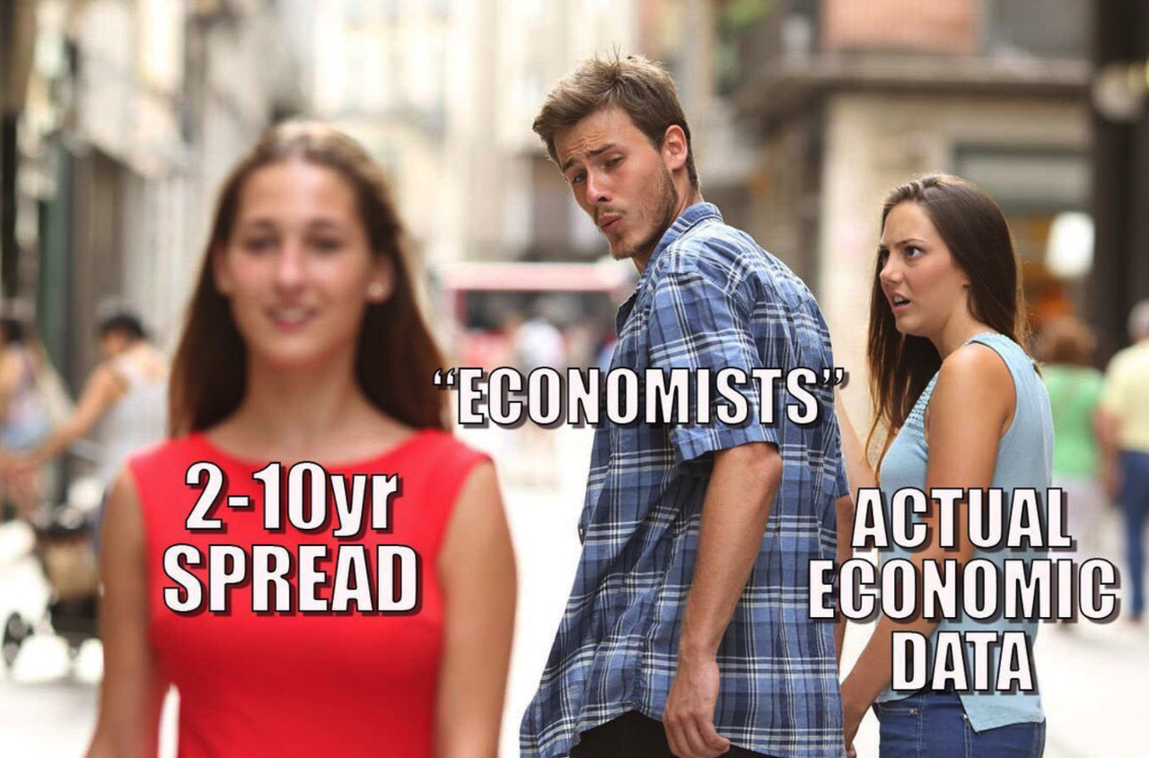足元の米国の経済指標は消費と雇用を中心に堅調であるため、経済の実態を無視して2y-10yの占いに没頭するエコノミストは上の図などで揶揄されがちである。しかし、消費やら雇用やらのActual Dataは所詮遅行指標であるため、(ISMやグローバルPMIならともかく)それらをインバート占いを否定する根拠としては使いづらい。