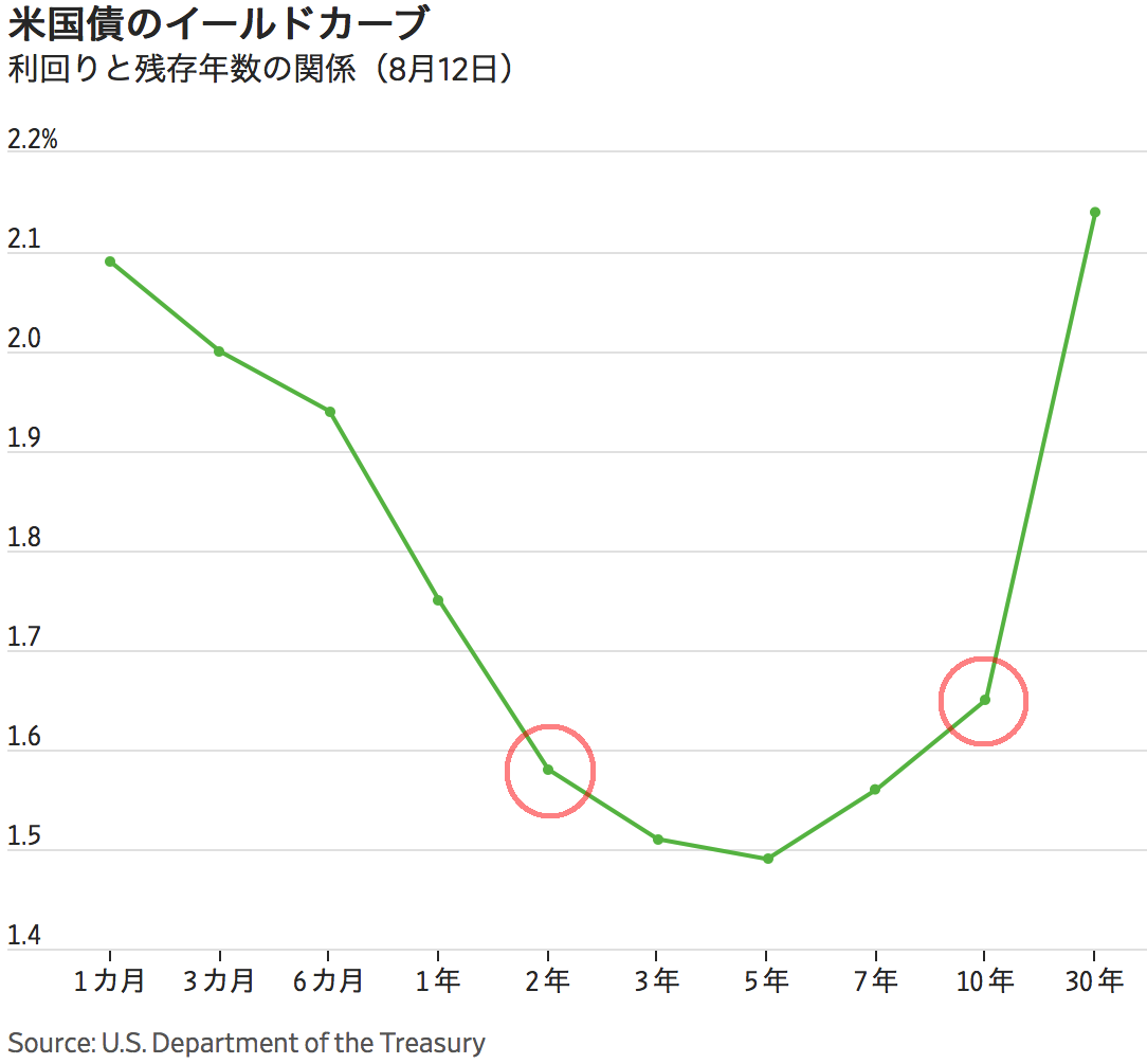 昨年の2y-5y、今年3月の3M-10yに続いて、8/14には米国債の2年と10年金利が逆転して逆イールドになった(インバートした)。長短金利の逆転は景気拡大終盤に発生しがちであり、金融政策対比で景気の先行きが弱いという市場参加者の見通しを表している。またこれまでもリセッションの2年ほど前に長短金利の逆転が見られることが多く、あまり縁起のよくないシグナルである。WSJの記事は「ニューヨーク連銀のモデルによると、7月末時点のデータでは、今後1年以内にリセッション入りする確率は32%となっている。これは2008年のリセッション以降で最も高く、1990年のリセッション前とほぼ同水準だ。これほど高い確率でもリセッション入りしなかったのは唯一、1960年代終盤のことで、当時は今と同様にインフレ率が低迷し、失業率も低かった」としている。