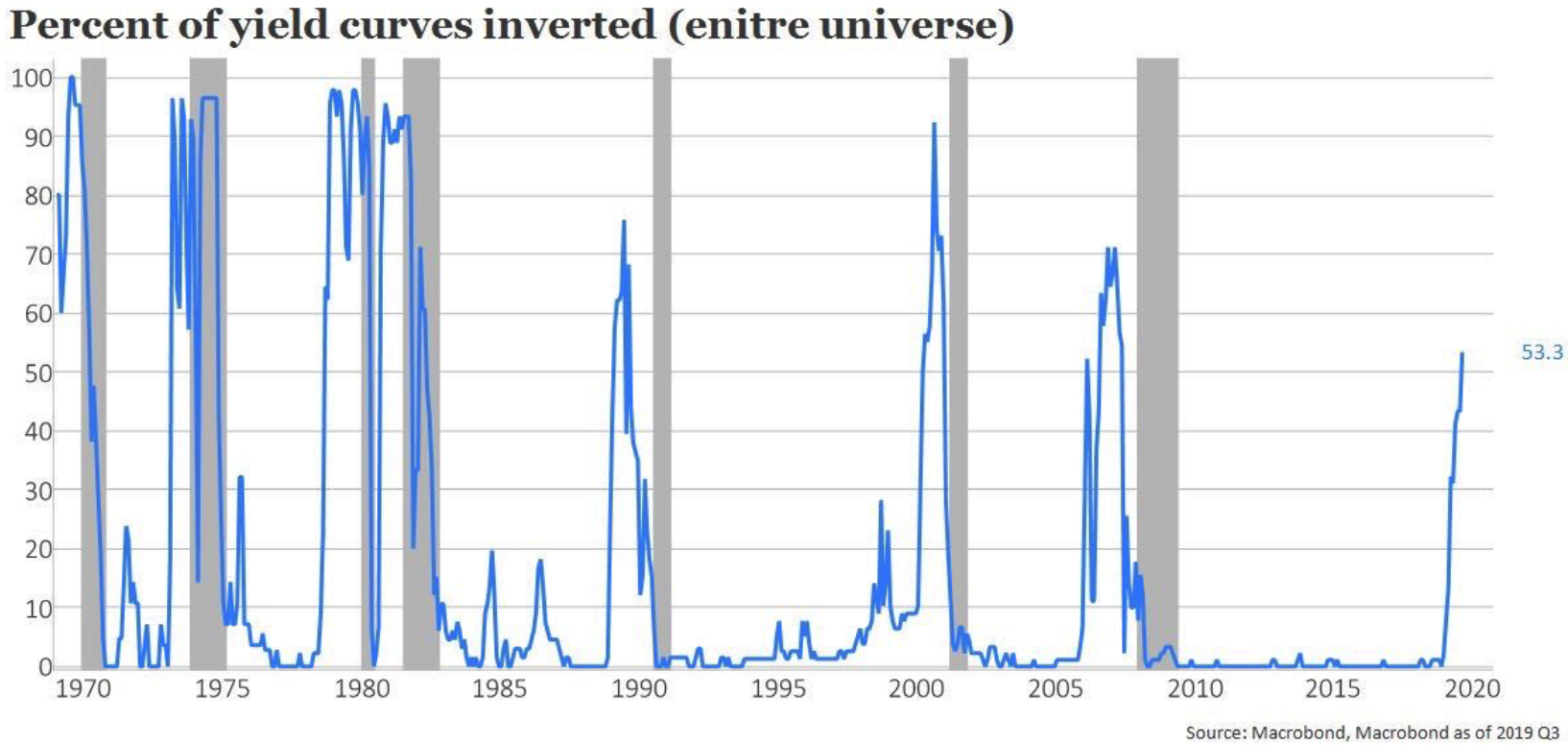 むしろ、QEでマイナスのタームプレミアムについてガタガタ言われている米国から離れてグローバルで見てみると逆イールドの国はどんどん増えており、FedのQEのせいにして「今回は違う」と言い張るのは段々と難しくなっている。もちろん金融危機後はどこの中央銀行も多かれ少なかれQE的な施策を取ってきたため、マイナスのタームプレミアムがグローバルで広がっていると言い張ることもできるだろう。