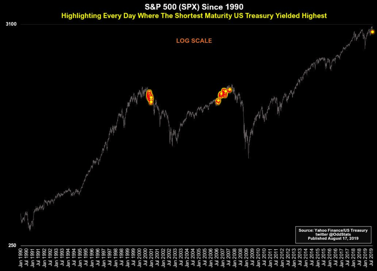 なおこの記事は頑張って「一部がインバートしたV字カーブと完全にインバートしたカーブ」の間に区別を付けようとしているが、やりすぎると都合の良い結論を出すための後出しになってしまう。シグナルはシンプルである方が良いのである。たとえば、カーブの形状で細分化するならこのS&P 500のチャートに「最も短期の米国債が最も利回りが高かった日」をプロットした図などはいかがだろうか。
