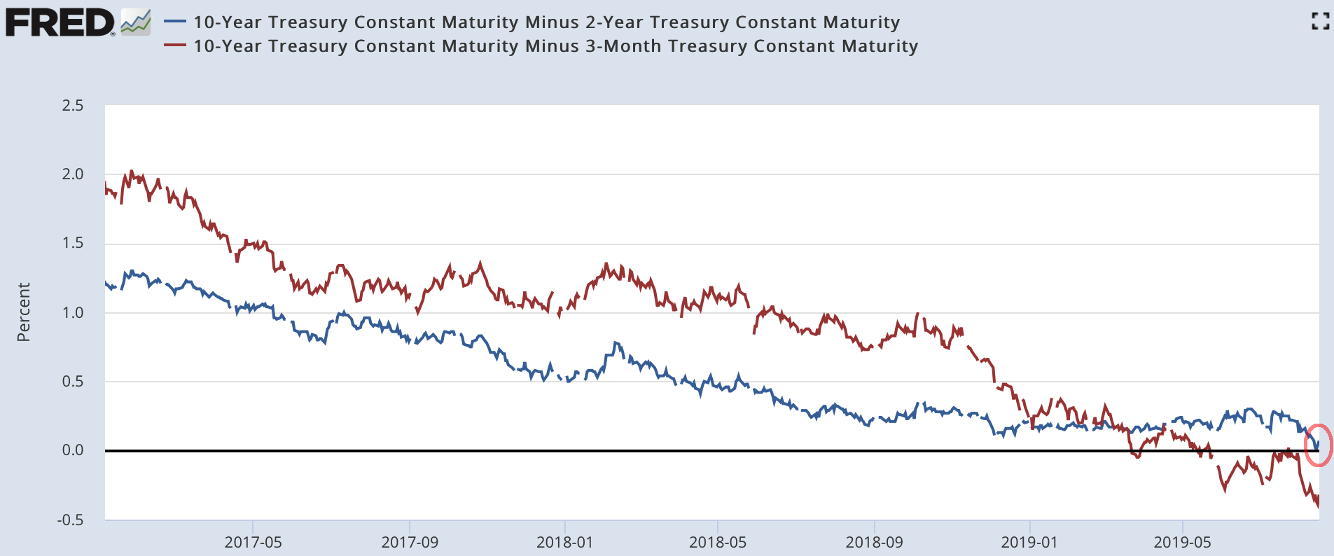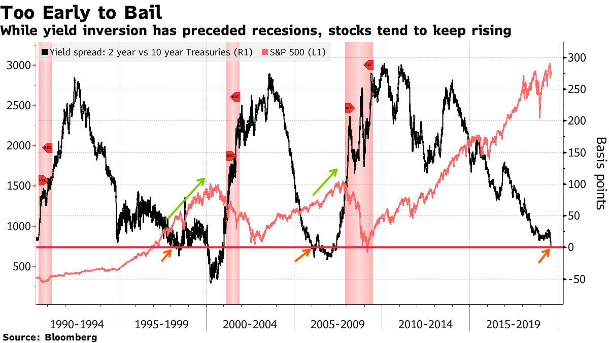 いずれにしても、とあるメジャーな年限がインバートするたびに株は暴落してきた。昨年12月の2y-5yインバート、今年3月の3M-10yインバートではその都度米株が売られた。2y-10yインバートを見たら流石に米株の下落に備えていないといけなかった。その後2回目の2y-10yインバートでも米株は瞬間的に売られており、おそらく機械的に両者を連動させる人間より賢いファンドによって、インバートは株式市場の頭上に吊るされたダモクレスの剣となっている。長期的に見ると過去のインバートからリセッション入りまでしばらく時間があり、インバート直後の米株のパフォーマンスも別に悪くはないはずだが、今回は株式投資家はさすがに学習して神経質となっている。