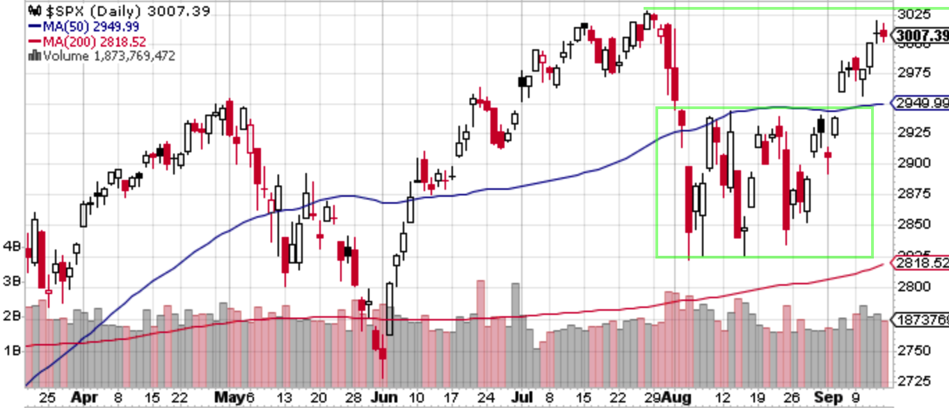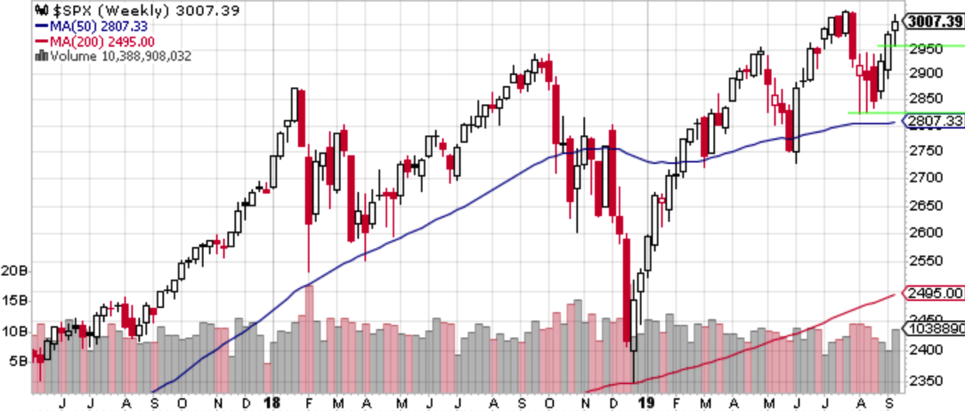 S&P 500はこの一週間指数としてはあまり動かなかった。「米中貿易交渉再開については(中略)少なくとも9月いっぱいはあまりネガティブなヘッドラインを警戒しなくても良さそう」「テクニカルにはやはり2820 -2950のレンジブレイクが大きい」「先週安値の2890、そしてすっかり遠くなった2820をサポートとして意識しながら押し目買いを図っていく形」とファンダメンタルズ、テクニカルの両面から押し目買いがワークすると予想したが、押し目はせいぜい2980から2950程度までで、そのまま3000を回復した。全体的に、小動きながらも堅調な動きとなった。
