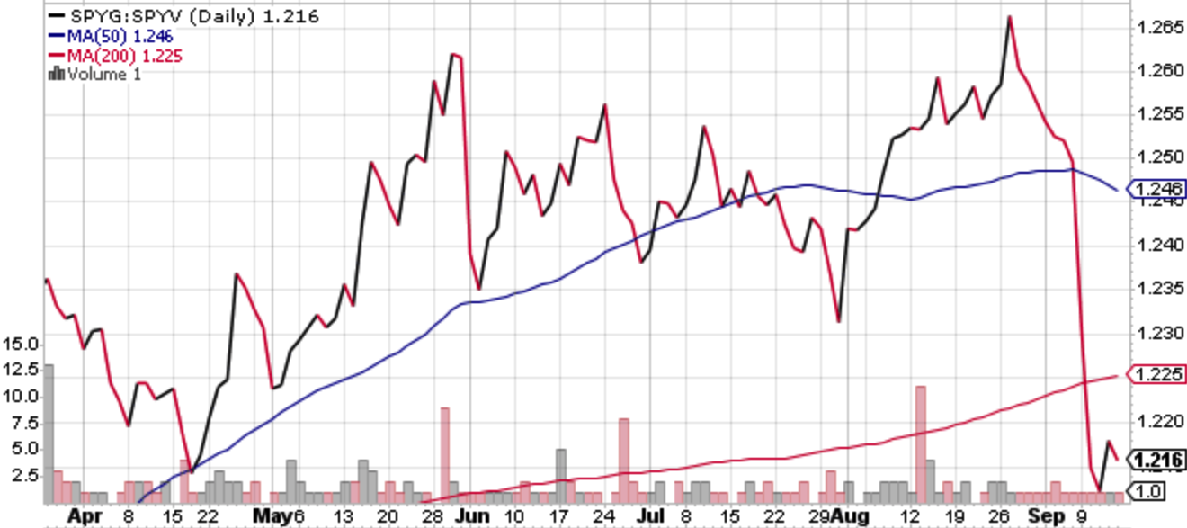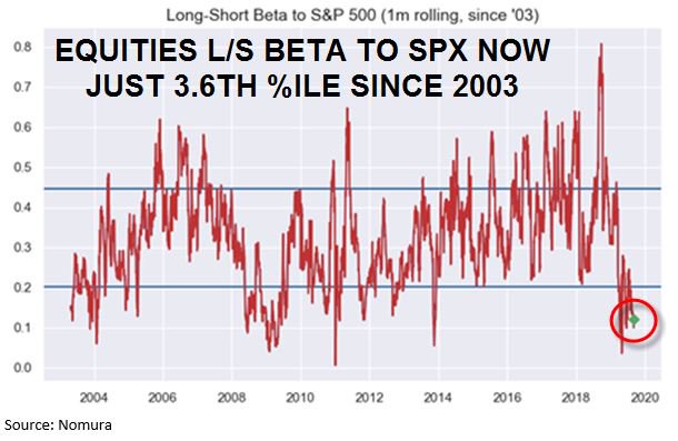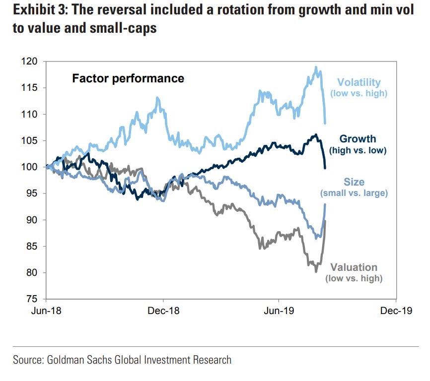 S&P 500指数は小動きだったが、いくつかの市場では大きな動きが生じた。米中貿易戦争が一転して解決に向かうという雰囲気の中で米金利(中図)は1.6近辺から1.9まで急騰。それに合わせてグロース銘柄からバリュー銘柄への急激なセクターローテーションが生じた。上図はS&P 500 GrowthとS&P 500 Valueの比である。これは多くの投資家にとってペインであったし、グロースに投資したくて株を買っている人からすれば株そのものから離脱するきっかけとなる。一方、景況感が悪く金利が低下する中、景気と関係の薄いからこそグロースへの逃避が起きていたことを考えるとその反転は必ずしもバッドニュースではない。