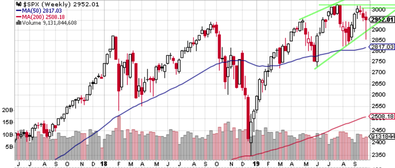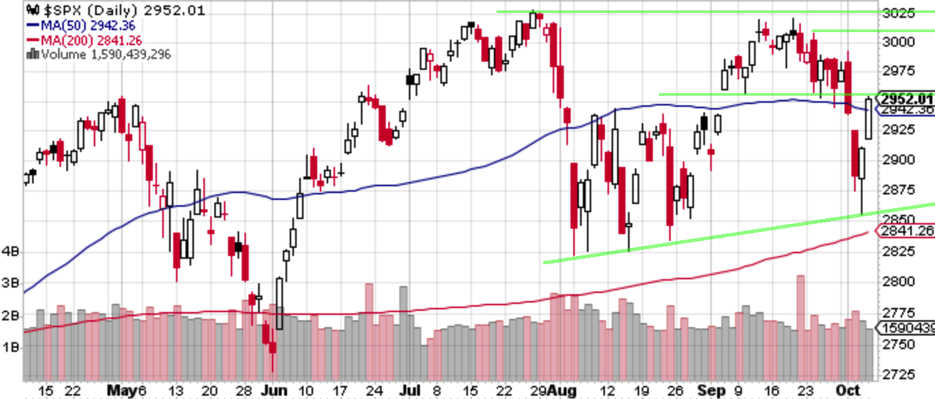 テクニカルには、8月と同様200日線の少し上でサポートされた形となる。6月からの上昇トレンドラインは一時期下にブレイクされたが、元々急すぎる上に再びラインの上まで戻っているためベアサインとしては完成しないだろう。3022から3008まで降りて来たレジスタンスは完璧な仕事をしたが、2850までの押しは期待以上であった。下方は週足下ヒゲによりサポートされているが、畢竟下ヒゲ陽線ではないため3008レジスタンスは健在。一方で200日線の2841〜先週安値の2850はサポート帯になりそうだ。とすると2850〜3008のレンジか。リセッションを織り込んでポジションを投げる(2850〜)のはやりすぎだし、一方で米国の景況感が悪化はしたので何か期待が変わるようなヘッドラインがないのに上を追いかける(〜3008)のも面白くないというところである。3008を突破されたら上方向に飛びやすくなり、2841を下に割られたらクラッシュが加速しやすくなる。