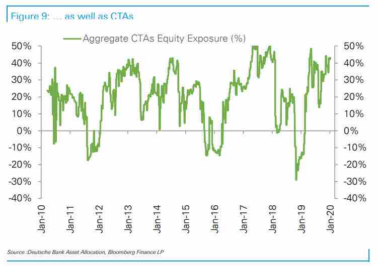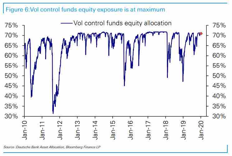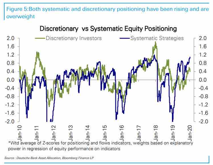 DBによると投資家の株ポジションは2017年年末の水準まで高まっている。リスクパリティ、volコントロール、そしてCTAのいずれも同じように株エクスポージャーを増やしている。裁量的投資家も同様である。特に最高値でシステマティックな危なっかしい人達がどんどん積み増している形なので、長期的な目線では全く入りどころではなさそうだし、ロングを引っ張るにしても戦術的と割り切り危うくなったらさっさとクローズする覚悟が必要だが、目先では強さをひっくり返すのは思いのほか難しい。10月のFedのQE再開以来ほぼ一直線で上昇してきたためテクニカルな手がかりもない。前回に続き押し目をどこまで深く拾えるかのゲームか。