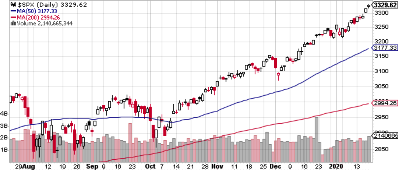 年末からS&P 500のメルトアップが続いている。1/15には米中貿易協議のフェーズ1が無事に締結された。今更目新しいグッドニュースでもなかったし、むしろ一部の人々には不満が残る内容であったが、当然そんなものは関係ない。不確実性がなくなったことが大事である。大々的な関税撤廃もなかったが、中国政府が言い訳のために考えた用語「関税が引上げ局面から引下げ局面へ」は案外本質を捉えており、クオンタメンタルな判断を吹き飛ばすような不確実性はこれでなくなる。「どれくらい引下げるか」や「フェーズ2」についての期待が上下してももはや瑣末な問題である。実際、先週後半の指数には毎日引け決めで発注する、最も足が遅そうな投資家が目を瞑って投げ込んでいる形跡が観測された。