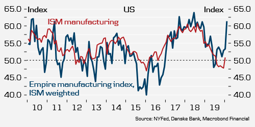 ダンスケ銀行はNYエンパイアステイトは日頃からボラタイルであることに触れつつ、ISM風に加重平均するとISM製造業の60近辺と整合的になる水準であるとしている。