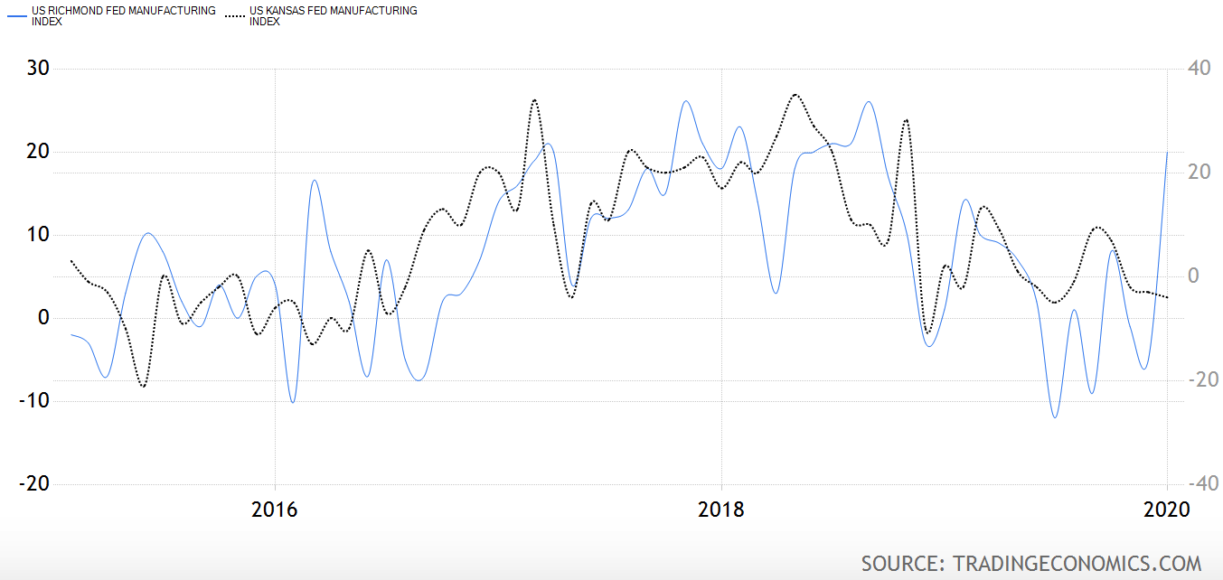 サーベイだけ見ると新型コロナが米国の製造業に大した影響を与えると米国企業の経営層は思っていないようである。まだ(シカゴPMIが表現したように)ボーイングの減産の方が大きい。1/15にフェーズ1締結によって一段落した貿易戦争は更に大きい。図は1/23発表のカンザスシティ連銀製造業景況感と1/29発表のリッチモンド連銀製造業指数であり、それまでよく連動していたのが一週間遅いリッチモンドだけが大きく反発している。そこに好調なISM製造業とNYステイトエンパイアが続いている形である。やはりフェーズ1締結が全米で幅広く企業活動を正常化させたことは間違いなく、その影響は新型コロナによっても打ち消されていない。