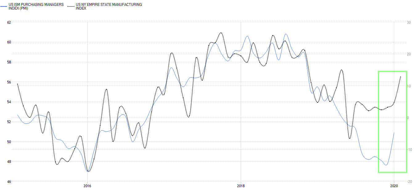 1月分米国ISM製造業PMIが大変良かったのに続いて2月分ニューヨーク連銀製造業景況指数(俗称NYエンパイアステイト)も大変良い結果となった。ISM製造業は1月後半のアンケートなので新型コロナ問題はまだ十分に盛り上がっておらず、寄せられたコメントの中でもごく一部しか新型コロナによる影響に触れていなかった。なので慎重な債券投資家を中心にISM製造業を新型コロナ問題勃発前のバックミラー指標にすぎないと見る動きが優勢であった。中国工場の稼働停止がグローバル企業のサプライチェーンに悪影響を及ぼすに違いないので、来月のISM製造業を見ないと景気回復を信じられない、ということである。そこに被せてきたのが絶好調のNYエンパイアステイトである。