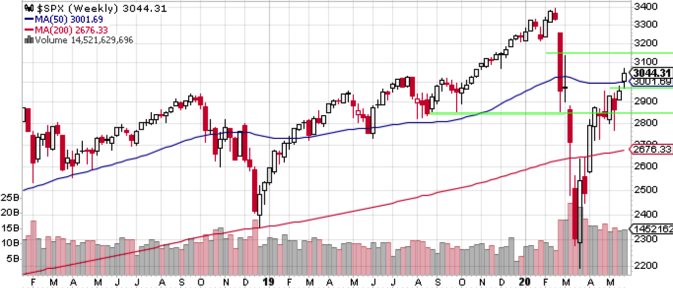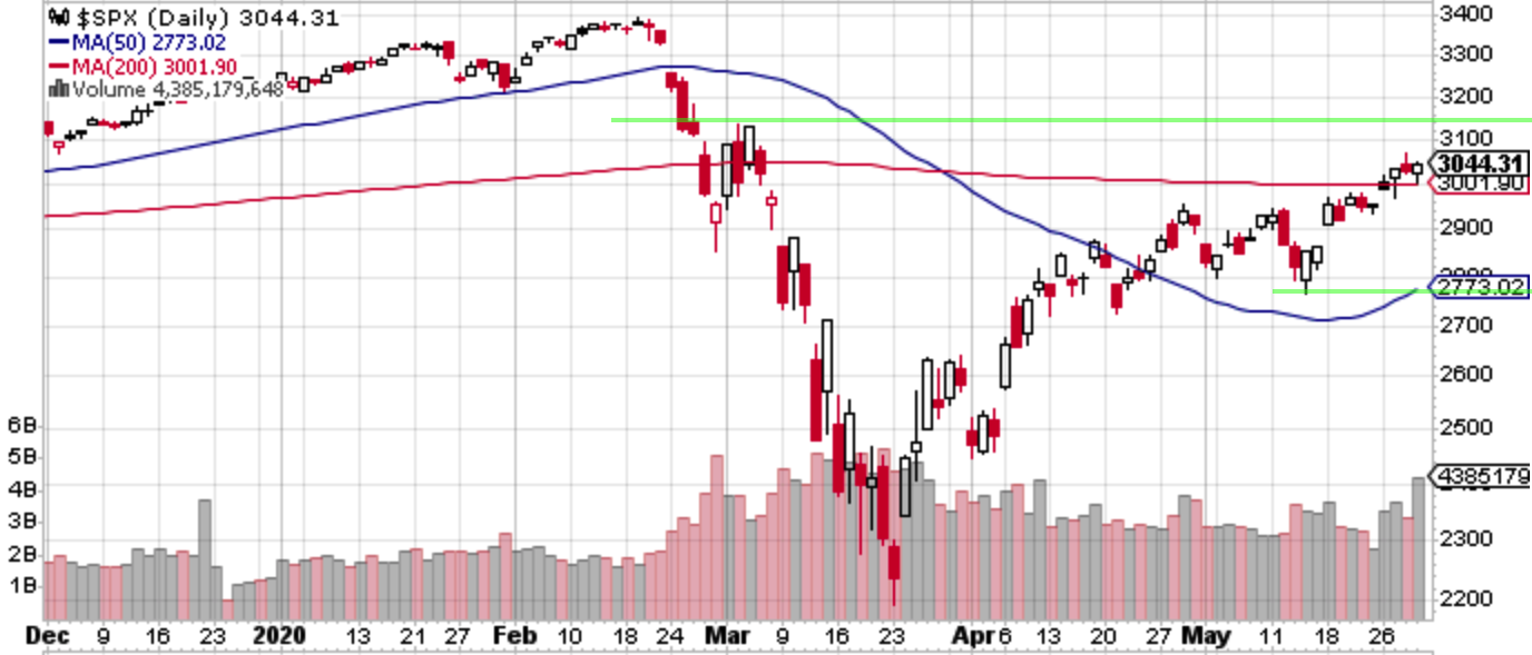 S&P 500は「中長期的な売り場」としていた2950 -3140間を一直線に駆け上がっており、あっという間に上半分まで付けた。原動力はもちろん本ブログがかねてから警戒してきたポジショニングの良さ(ショートの多さ)であり、経済活動の再開に伴いクローズで恩恵を受ける安全なNASDAQ一強からの巻き戻しも起きている。ばら撒きを受けた米国の個人の買い上げがシステマティック系のショートカバーを誘発し、この二大バリュエーションを気にしない勢力の買い上げが指数を動かしている。