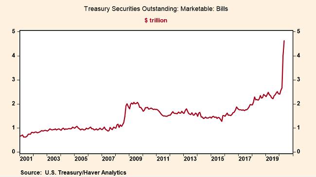 また広義のパブロフの犬とも言えるが、過剰流動性による壮大な株高というストーリーも一部では語られてきた。Fedの国債買入れ拡大に伴い、売り手の売却代金にあたる約2兆ドルはFedの超過準備やMMFとして短期市場に滞留しているわけであるが、これらの運用利回りは0%近辺であり、いずれ配当利回りが乗っている株にシフトして壮大な流動性相場になるのではないかという憶測である。春のパブロフの犬の記事でも本ブログは「銀行はレポでお金を借りられた、或いは保有する短期国債を売れて手元資金が増えたからと言ってポンと株を買えるわけではない」としてきたが、同じように国債を高く売れたからと言ってすぐに同じ金額の株を積んで株式のボラティリティを受容できる体制の投資家は限定的である。更に、このマネーは国債増発で吸収される可能性が高い。例えば短期国債T-Billの残高は既に2兆ドル増えており、ちょうど売却代金と同程度である。利回りが低いからと言って投資家が大挙してMMFを解約して株購入に動くと、増発されたT-billの引き取り手がいなくなる。もちろんそうなった場合はFedが更にMMFの購入を加速させれば解決できるのだが、そうなると今から決め打ちできるわけではない。長期国債を含めた国債市場全体でも同様であり、春から足元にかけては財務省の国債発行とFedの国債買入れの合計はネット吸収が続いたが、Fedの国債買入れペースが再加速しない限り今月か来月以降にはネット発行に転ずる可能性が高い。ネット発行が続けば「壮大な過剰流動性」とやらは遠くないうちに吸収されるだろう。国債を発行した財務省から国民の手に現金が渡って初めて本当の意味での過剰流動性が生まれる。国民の手に渡っていないマネーは全て見せ金である。