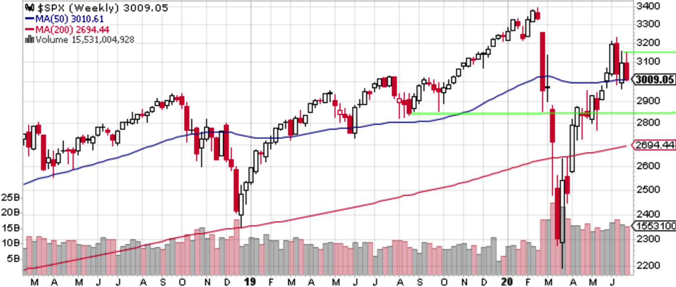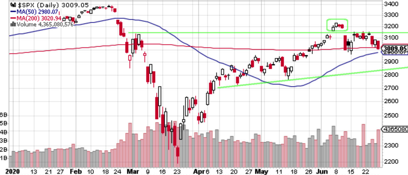 S&P 500は週間値幅3005 -3155と再び2970 -3140のレンジに概ね収まった。週明けはまずナヴァロの失言で一回クラッシュしかけたが、直ちに否定された後はショートカバーが優勢となった。しかし24日に発表されたIMFの世界経済見通しが悲観的であった、また無視され続けてきた米国の感染者数がようやく経済再開の足を引っ張るようになったことから、3140をやや超えたところから再び反落した。値幅、そして上にも下にも行きづらかった地合いも含めて先週の記事で記した「先週の値動きから3140は相当のグッドニュースに耐え抜いた非常に強いレジスタンスとして復活する。3140を仮に突き抜けたとしても上ではまだ雇用統計アイランドが待っている。先週よりは全てを無視して上がり続けそうな勢いが衰えているように見えるので、先週よりも押し目買い回転が面白くなくなる。一方、先週週明けに付けた2900後半の水準ではショートカバーしなかった後悔が残るだろうから下値を期待してのショートは張っても引っ張り続けづらい」としてきた通りである。