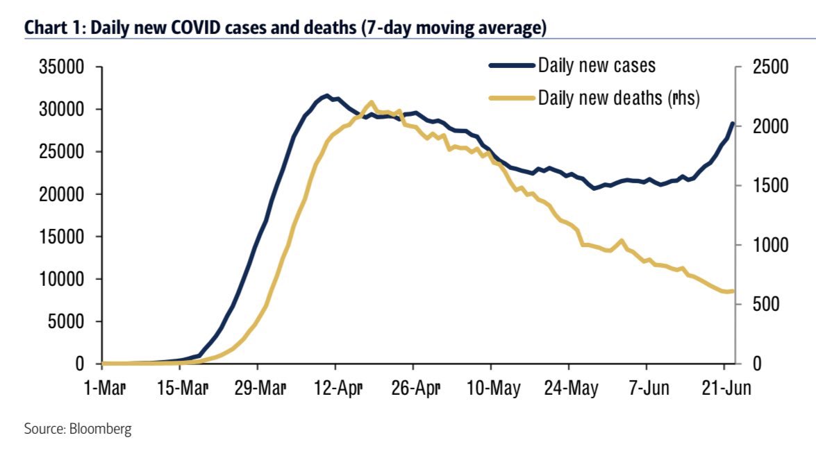 ファンダメンタルズ的にはIMFの世界経済見通し引き下げは相当な重みを持つ。2020年のGDPは4月時点の-3%から-4.9%まで引き下げられている。また来年のV字回復幅については+5.8%から+5.4%に引き下げられている。例えば6月初頭時点でのGS予想では今年-4%、来年+6.5%としているので、IMF予想がコンセンサスよりも大幅に低く、V字回復への期待に水が差されたことは間違いない。IMFが必ずしも投資銀行などと比べて世界経済に詳しいとは限らないが、今までもIMFの見通し引下げは相場にそれなりのインパクトを与えてきた記憶があり、軽視するのは危険である。