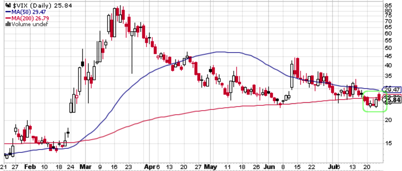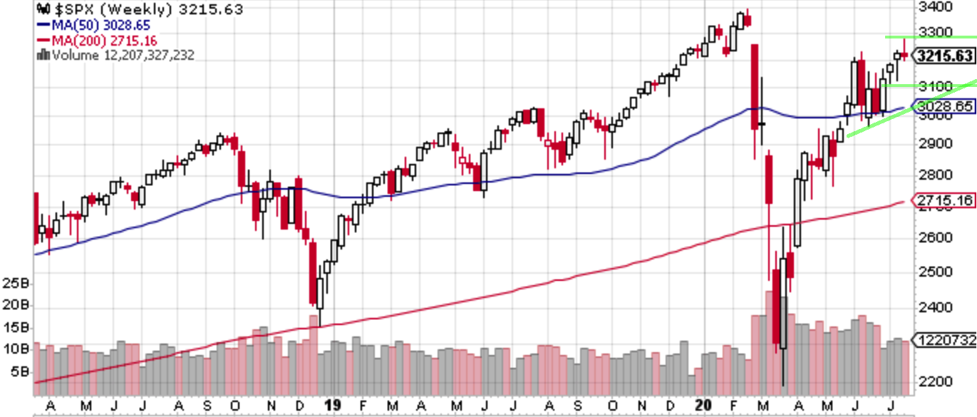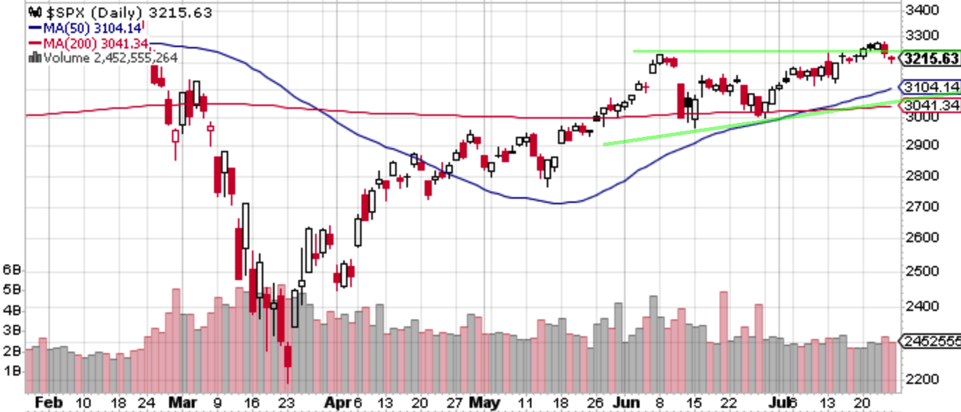 先週のS&P 500はまず上値を試した後に失速して戻ってきている。先週の記事で「(週足下ヒゲの)3127近辺は再び押し目買いゾーンとなりそう。このままVIXが落ち着けばそのうち上値余地も広がりそうではあるが、まだまだヘッドラインが控えている中での上値追いは油断禁物である」としていたが、3127近辺を試す機会はやってこず、上方向と上値追い油断禁物だけは合っていた。もっともヘッドラインと言っても「米中の領事館閉鎖騒ぎ」を予想できたわけがない。