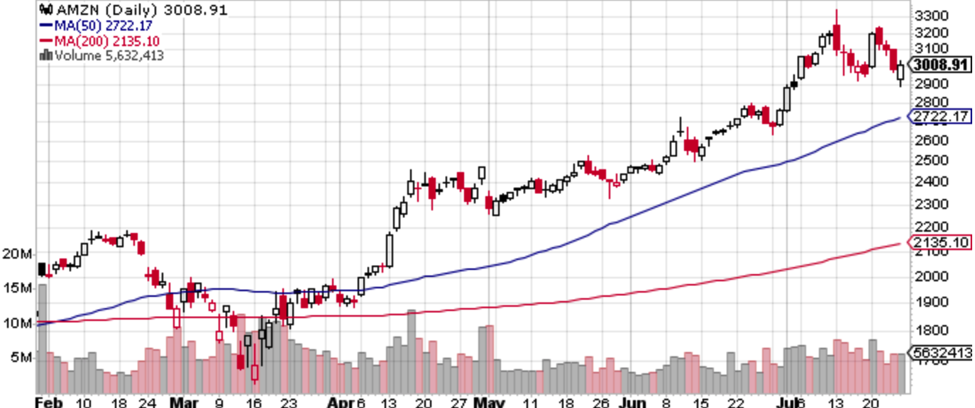 週明けにゴールドマンとジェフリーズがAmazonの目標株価を大幅に引き上げており、それを受けてAmazonは急騰したが週内には上昇分を全て吐き出してしている。最初のドローダウンで捕まった投資家をゴールドマンの煽りが二番天井で救出したダブルトップに見えなくもない。二回めの煽り上げは一回めよりペースが速く話題を呼んだが、別に高値を更新できたわけではなく、むしろ値幅が増えた分不安定化したように見える。そんなドタバタを経てナスダックもS&P 500と同様に週足上ヒゲ陰線となっている。あれほど盛り上がってから実際に決算がよかったテスラも二番天井を付けて下落している。今週は心なしかハードルが上がったFANG決算が更に続く。しかし、週後半にナスダックが弱含んでも「リーダー達も上値が重いが、それでも指数内のローテーションの範疇に収まっているためS&P 500指数そのものは値持ちがよい」としていた図が続いており、それなりにインパクトのありそうなヘッドラインの割りにはS&P 500そのものは大して下がったわけではない。