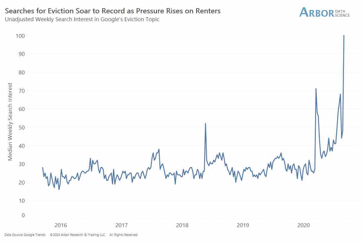 一方今まで安定して伸びていた家賃(上図赤)の下落も鮮明になっている。都会で職住近接していた人達が密を避け、またどうせリモートになるな権力らと郊外の広い家に移住し、車通勤に切り替えているようだ。都心の空室率は上がっている。「主要都市での需要減により、家主が新たな賃借人向けの家賃を引き下げざるを得なくなっている状況」との観測もある。強制退去の検索件数も増えてきた。