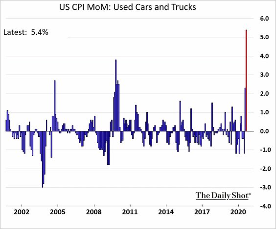 米国のコアCPI(上図緑)は堅調であり、アパレルや航空運賃が外出の減少で崩れる中でも全体としてデフレに転落する雰囲気がない。目立ったのは中古車価格(上図青)の上昇であり、8月分CPIではこれがコアCPI前月比上昇分0.4%の4割以上を占めている。中国でも同じ傾向が見られているようだが、公共交通機関の利用を避けるために自家用車を揃える動きがあるようだ。新車の方は生産が止まっていたことから品薄だったり品揃えが悪く、また給付金をもらえたとはいえ消費者にも節約志向が広がっているようである。またレンタカー企業の経営悪化により、新車を購入して中古車を供給するフローも鈍っている。少し前に破綻するレンタカー企業による処分が中古車相場を押し下げるのではないかと危惧されてきたのとは隔世の感がある。