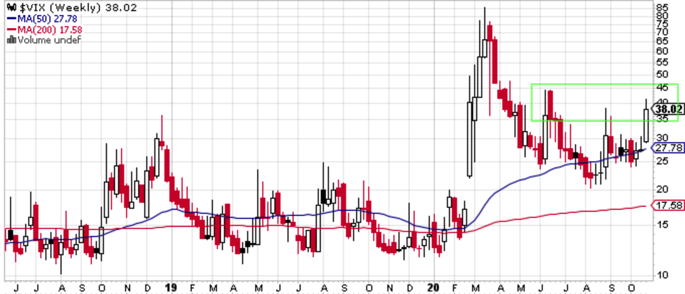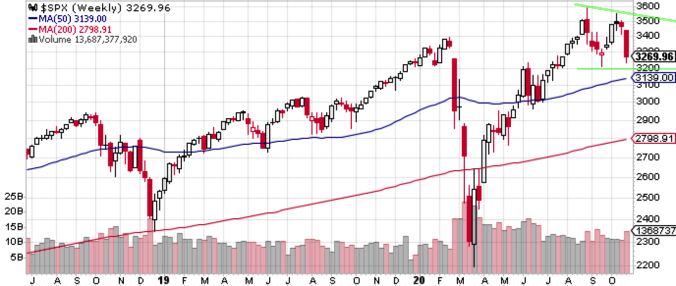 先週のS&P 500は久々に想定レンジを大幅に下回ってしまった。というよりほとんど掠ってすらいない。「3350 -3550レンジが3415 -3550に切り上がりそうであるが、大統領選前は引続きレンジ決め打ちは避けたい。イベントさえ通過さえすればボラティリティは下落しそうであるが、あまりフライングしたくないものである」としていたが、月曜朝一からレンジを下に切ってから欧州のコロナ変異株の再流行を受けた再ダウン、大統領選前の給付金再開の断念(よく今週まで期待が繋がったものである)、またAppleとAmazonの決算が投資家の目線に届かなかったことから指数の暴落が続いた。懸念材料が複数出てきたため気持ちよく売りを入れられたようである。また差し迫った大統領選について改めて接戦が意識されるようになった。
