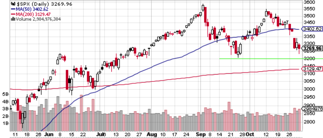 テクニカルは9月の急落に続いて10月の急落も前もって察知することができなかった。もはや勝敗が決した感もあるが、一応9月急落の底にあたる3200はサポートとなる。その下には更に200SMAの3130が控えている。値ごろ感では9月の急落で買い場としていた水準に近い3130 -3200間はさすがに買い場に見える。一方それまでサポートとしてワークしていた3350はレジスタンスに転化しそう。大統領選の結果によらず3300以上があれば苦しくなったポジションの解消に適した場になるか。ここまではもし天井ショートできればよかったがもし9月のレンジ内での推移で終わった場合を考えるとこの水準からショートを立てるのは割に合わなそう。