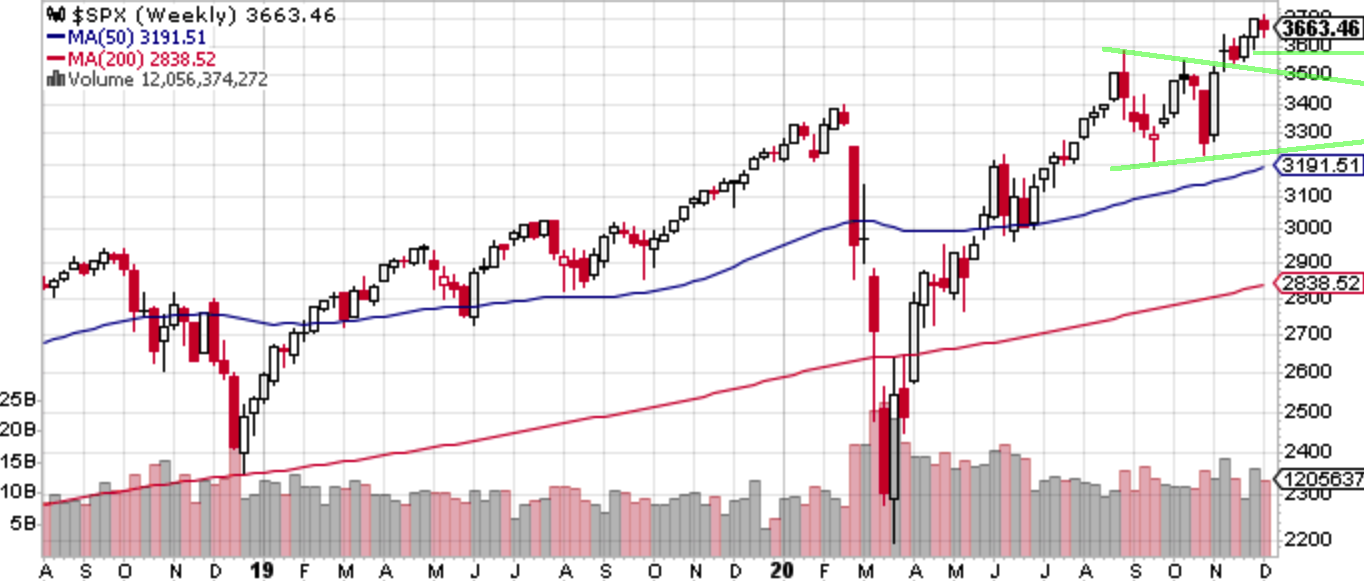 先週のS&P 500は米国の財政協議とBrexit協議という二つの政治的な茶番に振らされる週となった。FBが独禁法違反で提訴されたのをきっかけに週半ばにアウトパフォームしていたナスダックが利食いに押されて崩れ、更にBrexitの悲観的なヘッドラインが下値を叩いたが、日足ベースでは下を叩いても押し目買いに跳ね返される展開となっている。元々「3650をブレイクしたら付いていかないとその後の対処が難しくなる」としていたが、現実には3650近辺でウロウロしてしまっている。もっともサポートとしていた3600はまだまだ遠い。