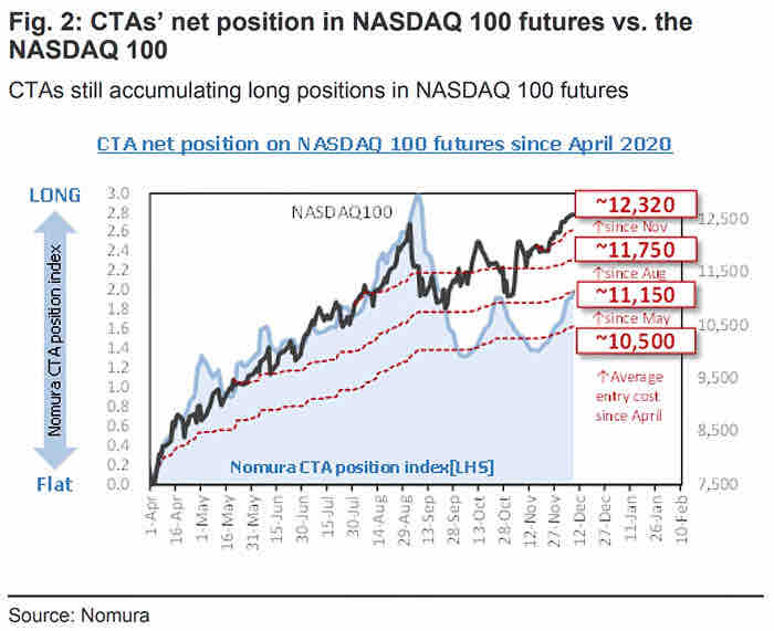 野村によるとCTAは(ダウやラッセルから興味をシフトする形で)再び高値圏でナスダック先物のロングを積み上げている。もっとも8月ほどは極端に積み上げていないようであるが、コストがどんどん上がっていくのも厭わない買い方のようである。今更春や夏のように(ワクチンや財政などの)ファンダメンタルズのグッドサプライズで1日に何%も上がることはなさそうだしショートカバーの需要もたかが知れているので、指数の上値追いはこういう確信犯的な買い上げにかかっているようなものである。