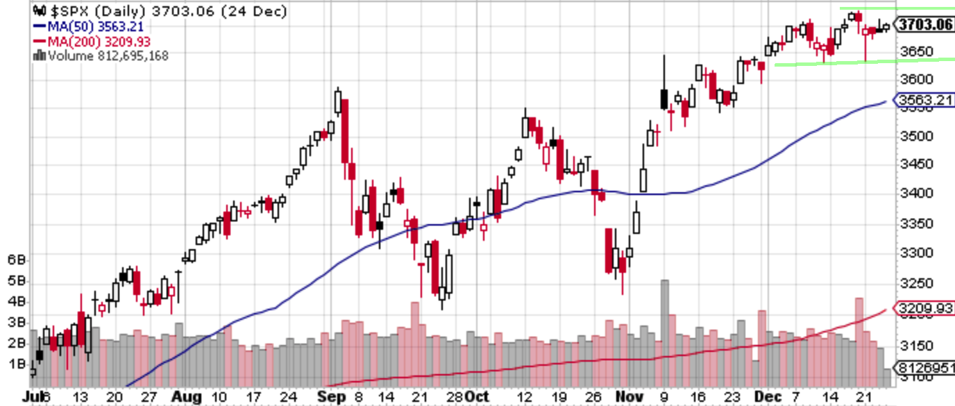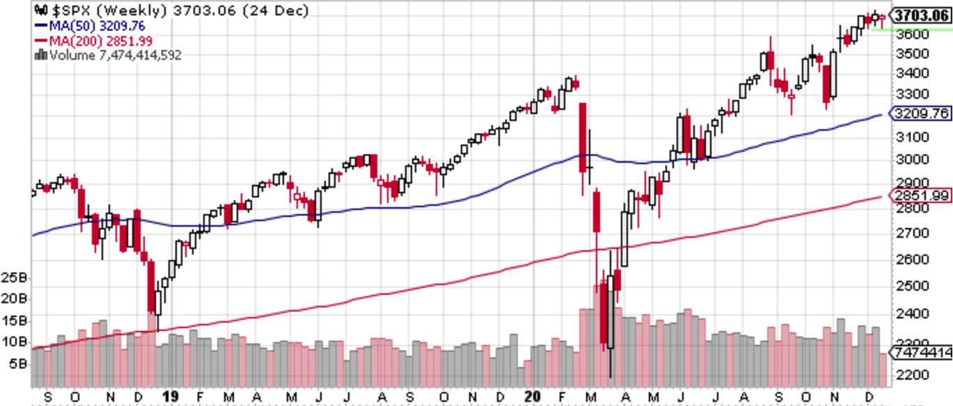 S&P 500は月曜に想定以上の下げを演じた。イギリスでコロナウィルスの変異種の感染が拡大したことなどを受けて久々に金利低下・ドル高・米株先物急落の典型的なリスクオフとなった。しかしそれも米国市場がオープンして下を叩く動きが一段落すると押し目買いが優勢となり日足が長い下ヒゲ陽線となった。クリスマス前の他の取引日は消化試合のようなものであった。Brexitと米国財政案がそれぞれ決まったが共に大したインパクトがなかった。先週の記事では「引続きファンダメンタルズはよくも悪くも材料視されるのは初動のみではないかと思われる」「先週までの3600から3645までサポートが上がっており、3600台でどこまで深く押し目を拾えるか。もし3645を下回った場合はもう少し調整が長引きそうである」としていたが後半は蛇足になった。3645の下ヒゲを割ったところで大して走らず、週足は2本目の下ヒゲ陽線となった。