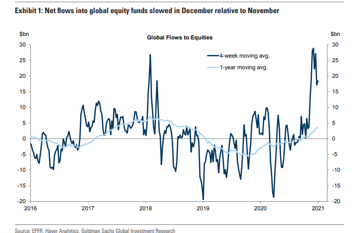 グローバルの株式への資金流入ペースは11月に記録的なものとなっており、12月はやや減速しているが依然高水準である。これが指数を持ち上げているわけであるが、前回同じくらいドカッと流入したのはトランプ税制改革からVIXショックにかけてなので縁起はあまりよくない。