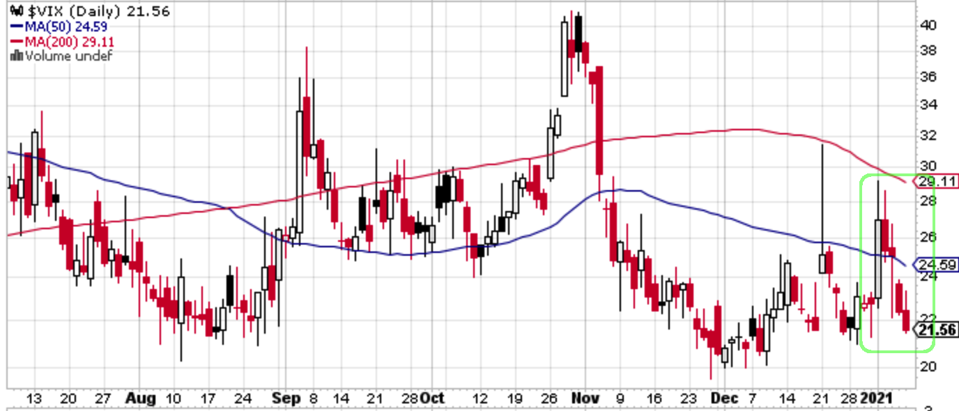 VIXはジョージア州補欠選挙前に一時27まで上昇したが、ブルーウェーブが実現すると再び崩れて22を割ってきている。ブルーウェーブか非ブルーウェーブのどちらかしかあり得ないのだから一体何を警戒していたのか呆れてしまうが、警戒していたのは「値動き」そのものだったのだろう。値動きがなかったを確認して遅れて崩れるようでは足元カナリアとしての役割はあまり期待できない。