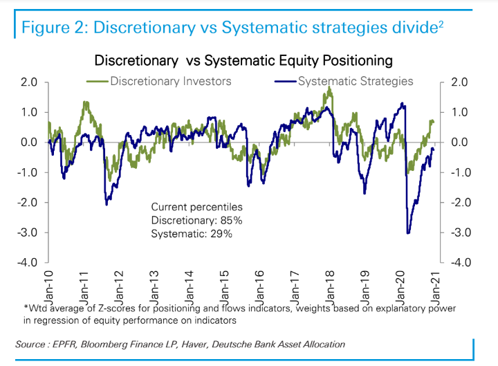 リスクパリティはむしろ大統領選を通過したところで株ポジションを落としている。昨年までの低ボラティリティレジームに戻らないことにはこの辺りが精一杯なのか。一方Volコントロール型は相場が落ち着くたびにポジションの復元作業を進めているが、まだ過去最高水準まで少しだけ距離がある。この辺りの参加者が最もユーフォリアに置いて行かれている形となる。