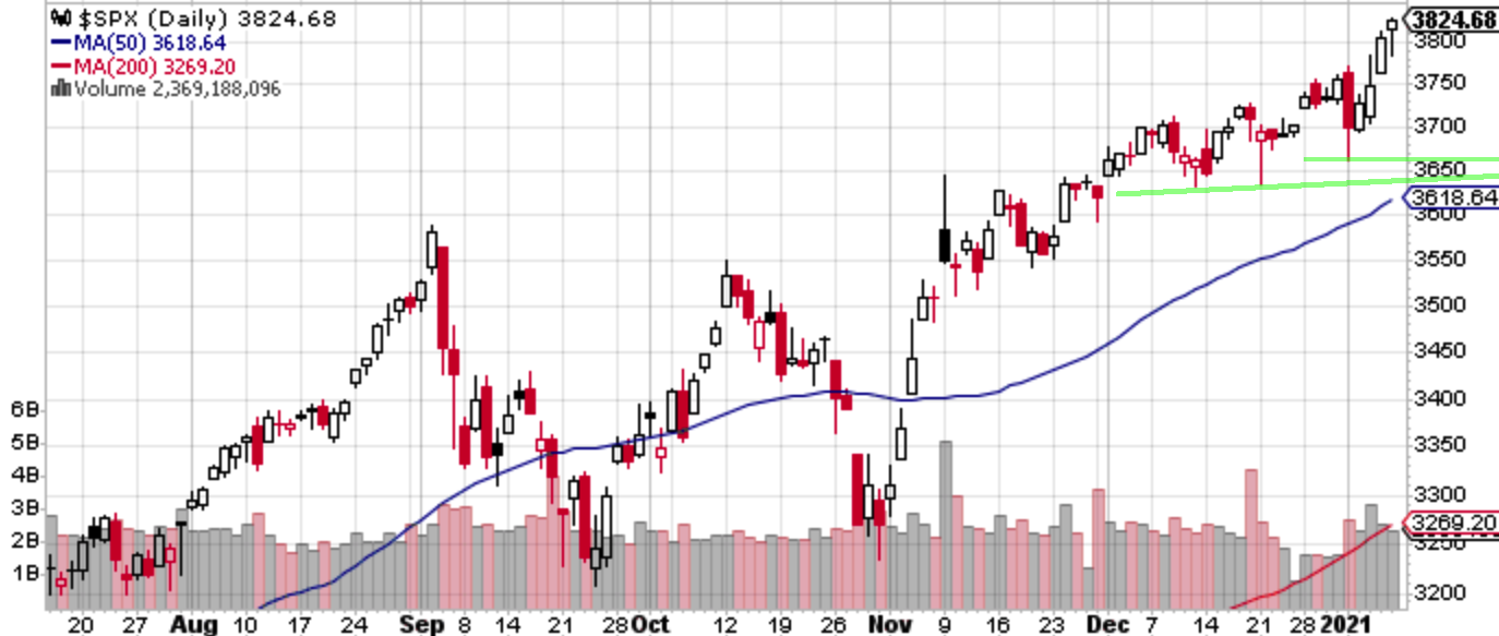 そして実際にブルーウェーブが実現して民主党が上院支配を奪還した形となるが、これは時間外で既に決定的になり、ナスダック先物などは一時下値を掘ったものだが、前日に既に一度警戒の押し目を作ったということで米国時間になるとまともな押し目すらなかった。「60議席に達しない50:51の単純過半数で何ができて何ができないか」を議論しているうちに指数は都合のいい解釈をして戻ってしまい、挙句の果てに実現するかも分からない給付金の増額話も出てきてメルトアップとなった。まさに確信犯的な上げである。ブラックスワンとも言われるブルーウェーブを当てても報われないのだからショートの分の悪さは半端ない。