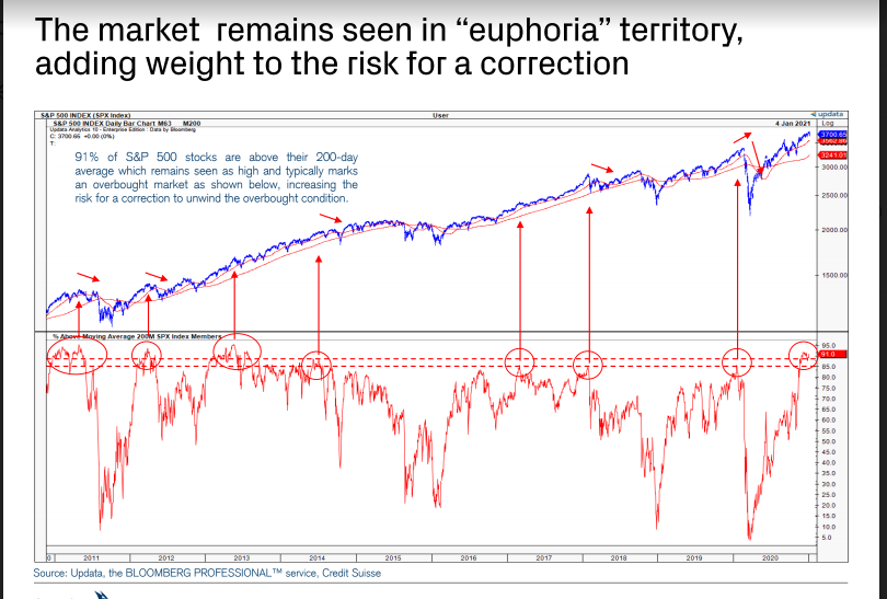 クレディ・スイスによるとS&P 500の91%の銘柄が200SMAより上に位置しており、やはりユーフォリア域である。過去にこの水準が来た後に大きく調整したこともあれば調整しなかったこともある。